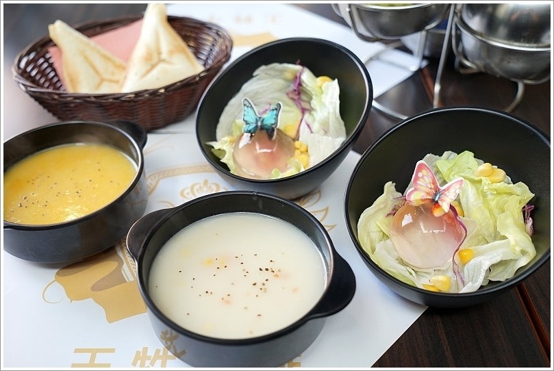 ▼首先副餐上桌啦!除了兩種湯品之外,還有綠野仙蹤沙拉、棉花糖吐司,跟一般牛排館比起來多了創意與巧思!