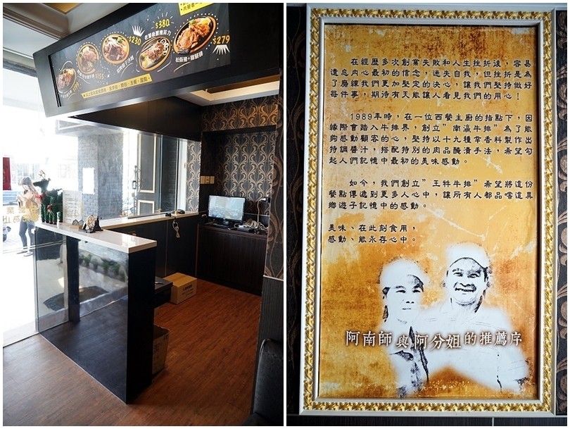 ▼一進到裡頭會有一個接待櫃台,等到有位子就可以上樓用餐囉!牆上還有創辦人阿南師與阿分姐的簡介,「王牪牛排」的前身是「南瀛牛排」,在雲嘉夜市經營已經有30年的歷史,對品質的要求、搭配19種香料熬煮出的特調醬汁更是讓在地客人回味無窮!
