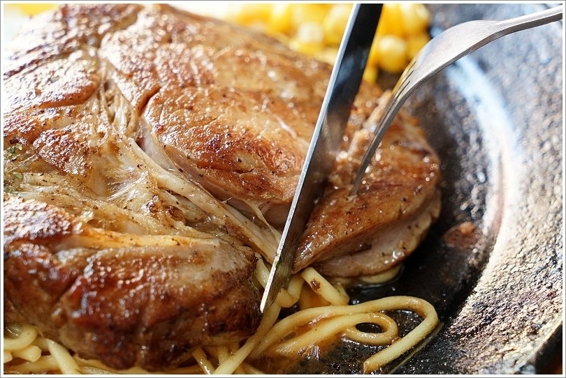 ▼大家一定想說這麼厚實的肉排會不會很乾柴!殊不知用牛排刀輕輕一劃就能切開,而且還能感受到澎湃湧出的肉汁,讓人更期待它的美味!