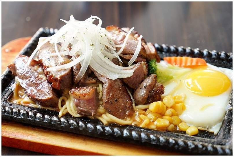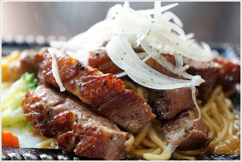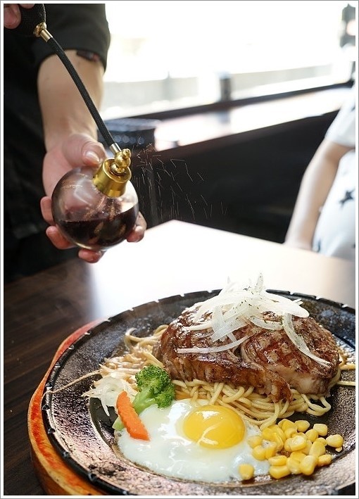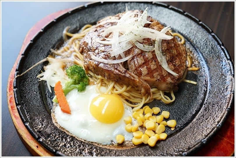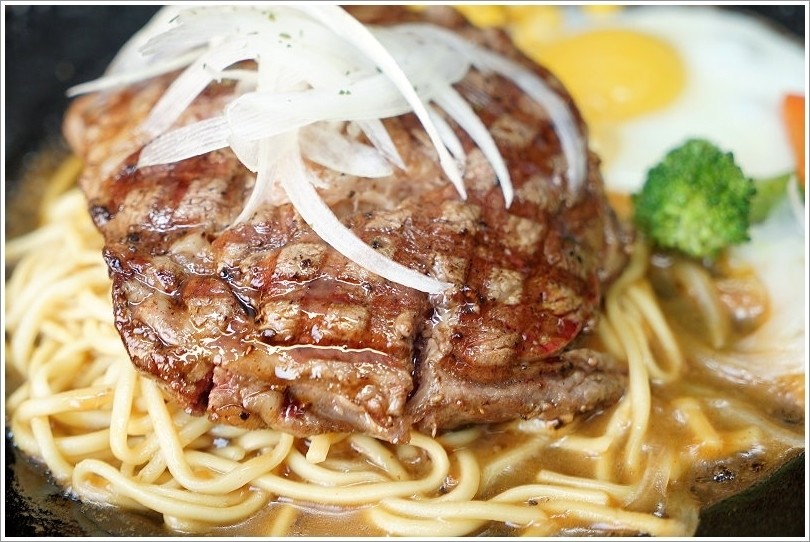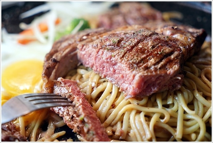▼店家特別選用澳洲穀飼高級肋眼香煎至5分熟,再搭配鐵板麵佐蘑菇醬、蔬菜、洋蔥、蛋等配料,一整個份量十足啊!