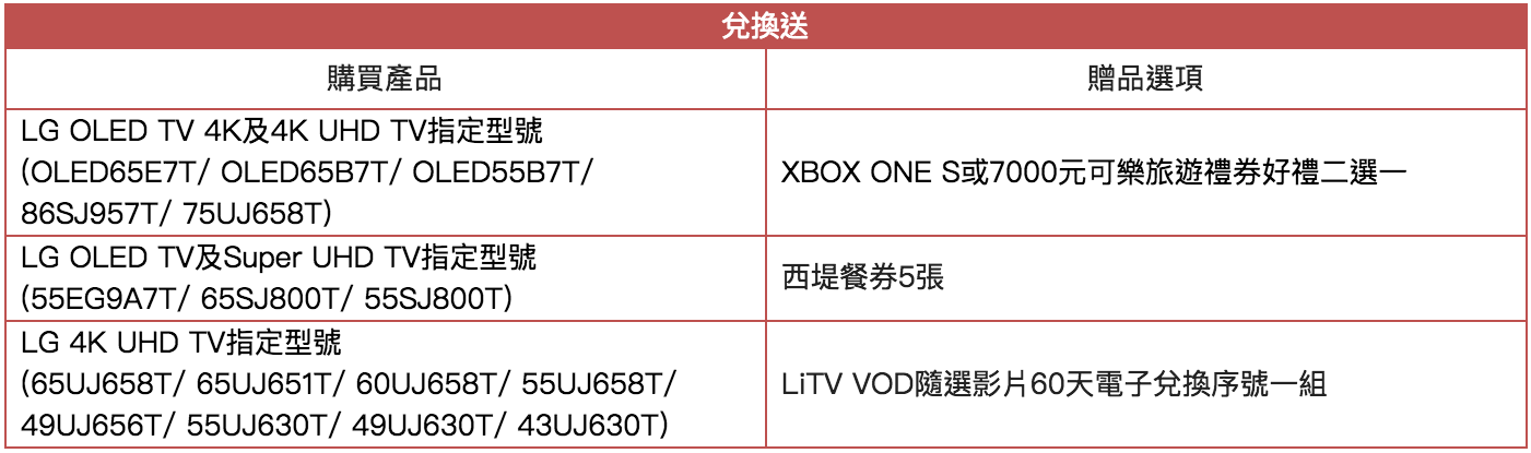 兌換送:活動期間,凡購買指定電視機型,並完成回函申請或線上註冊登錄,即有機會獲得各項好禮。