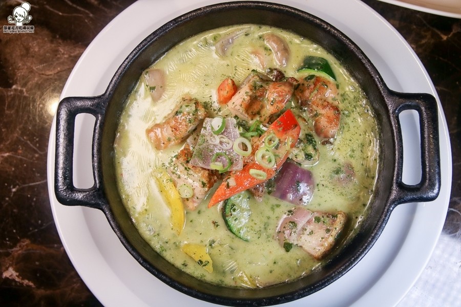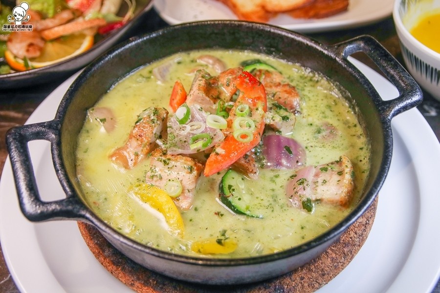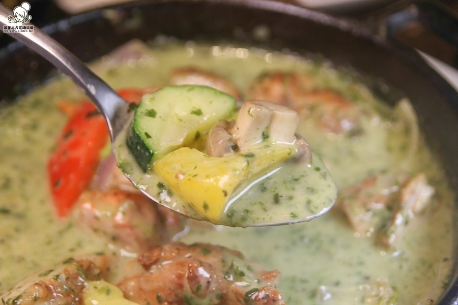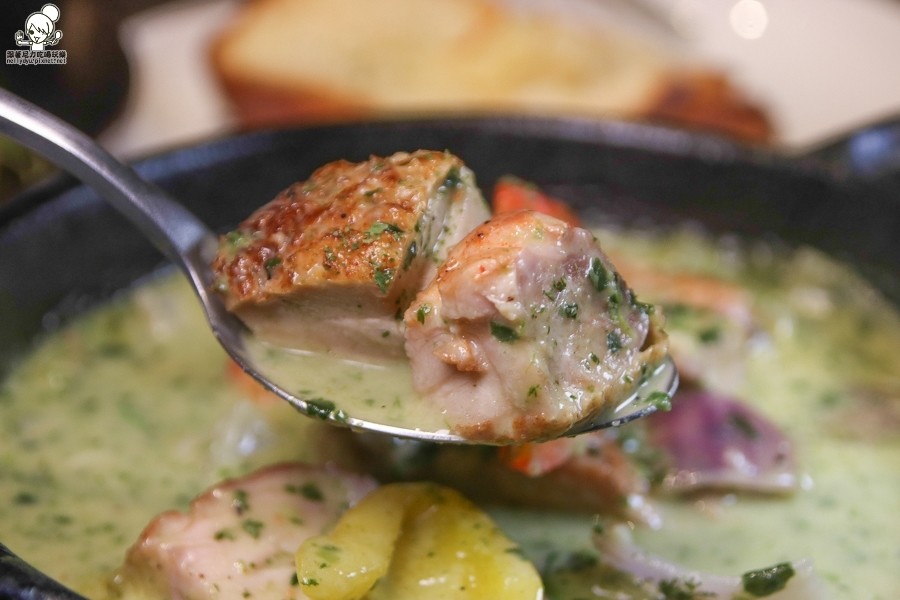 很像青醬顏色的綠綠的香草奶油鐵鍋燉雞,使用新鮮的香草製作出獨特的青醬