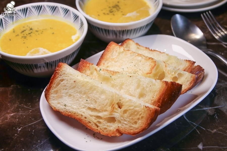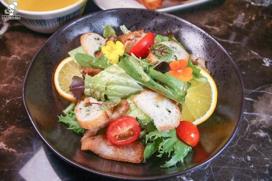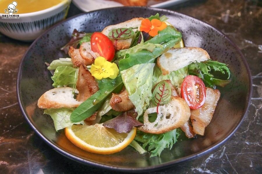 沙拉內也搭配了軟法麵包增加口感,帶有柳橙果香滋味很開胃