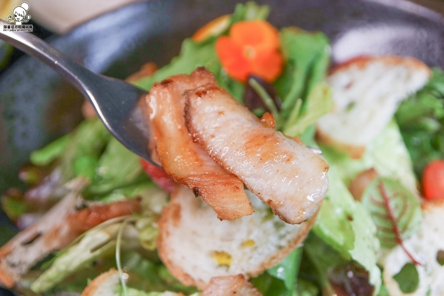 油煎過的松阪豬肉帶有脆度與豬肉本身的甜味,讓生菜不乏味很好吃