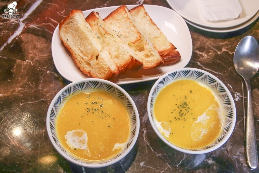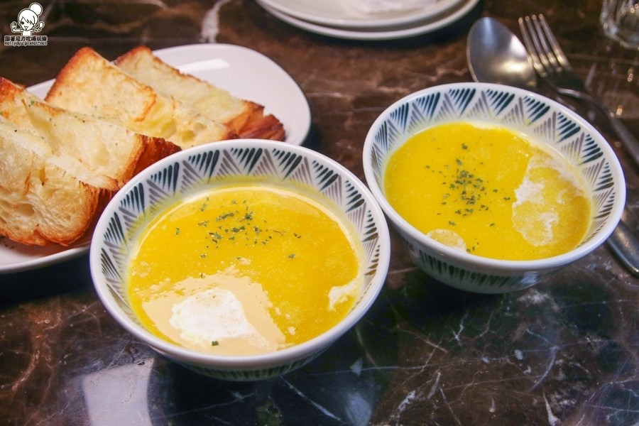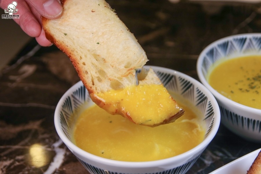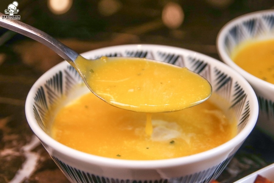 主廚特製的南瓜濃湯,新鮮南瓜熬煮的香甜南瓜