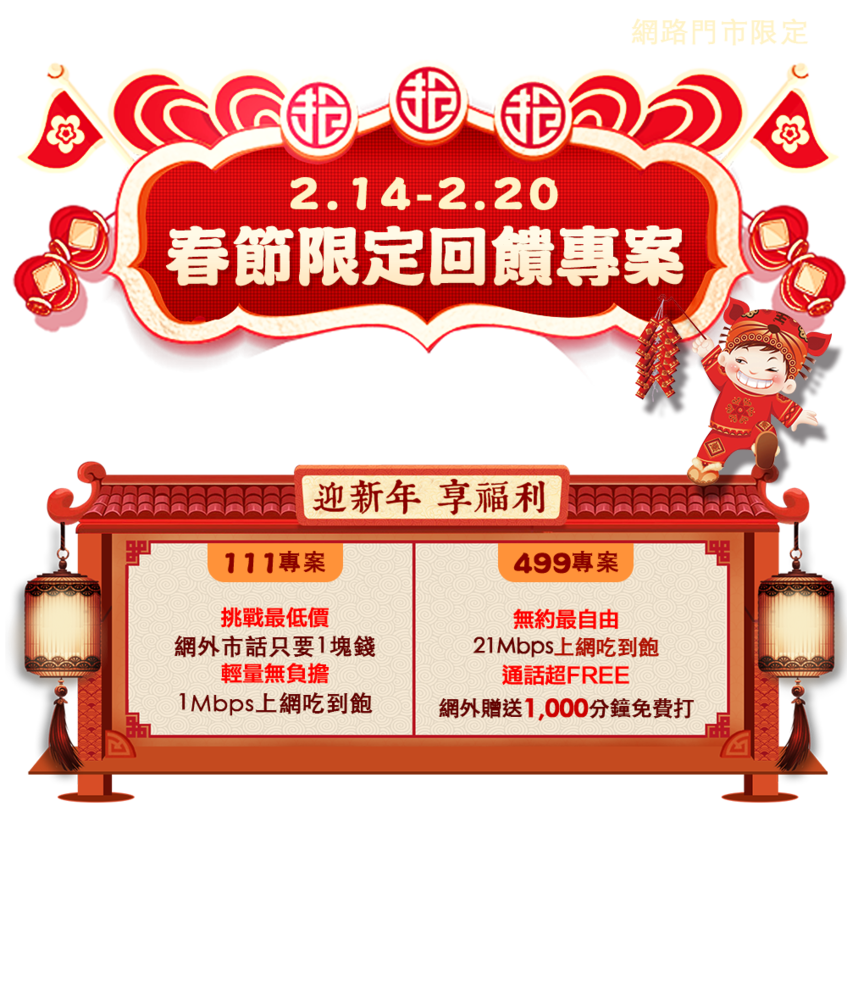 亞太電信迎接新年春節又適逢情人節,自2月14日起至2月20日止,於亞太電信網路門市推出限定回饋專案。專案一:「金選$111」短約12個月,只要月租$111享每月1GB贈送上網傳輸量、超過則以1Mbps輕量吃到飽;網外及市話更享11分鐘免費、超過後每分鐘只要1塊錢!專案二:「旺速$499」不綁約,享有21Mbps上網吃到飽,每月再享網內免費,網外及市話免費暢打1,000分鐘!