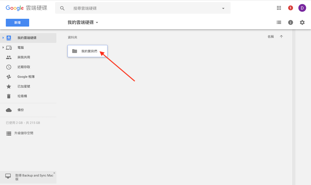 當資料夾已建立成功後,就能在我的雲端硬碟中看到剛剛建立的資料夾,未來如果要上傳文件、圖片、影片與音訊…等資料,即可透過拖曳的方式從電腦資料夾放到雲端硬碟的資料夾中,讓這些欲上傳的資料可以快速上傳完畢。