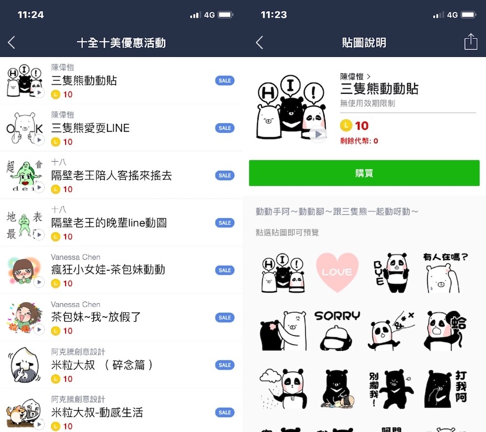 「LINE 十全十美優惠活動」共有十組貼圖進行限時優惠,像是三隻熊動動貼、三隻熊愛耍 LINE、隔壁老王陪人客搖來搖去、隔壁老王的晚輩 line 動圖、瘋狂小女娃 – 茶包妹動動、茶包妹 ~ 我 ~ 放假了、米粒大叔 (碎念篇)、米粒大叔 – 動感生活、綜合口味運動會 2!! 以及綜合口味運動會!,大多都是動態貼圖,也有少部分的靜態貼圖,每組貼圖只要 NT$6 元,換算成 LINE 代幣每組貼圖也只需 10 枚代幣,想要擴充圖庫的朋友,務必把握這次機會。