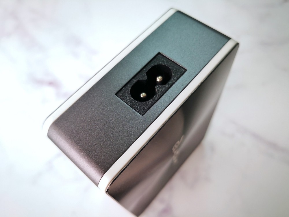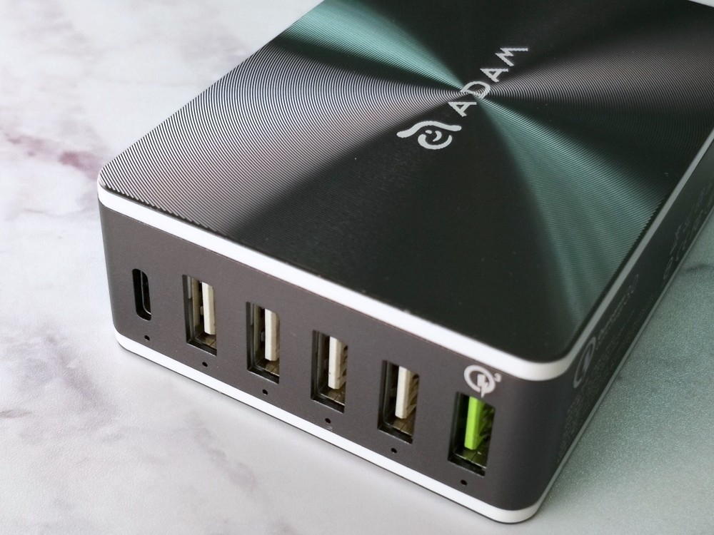 側邊由左至右分別是獨立 Type-C 充電埠,提供 5V/3A 輸出、4組 5V / 2.4 A USB Type-A 充電埠、1埠獨立支援 Qualcomm Quick Charge 3.0,提供 3.6-12V/1.5-3A (18 W) 的大電流輸出,總輸出達 81W。