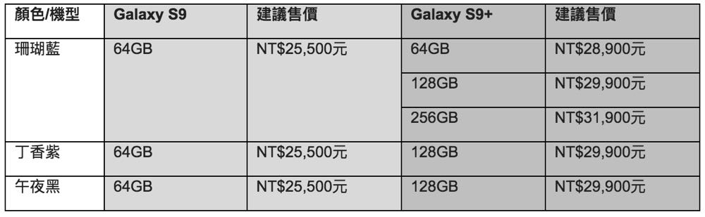 Samsung Galaxy S9/ S9+ 發表後除了「陷阱快門」、「AR 動態貼圖」等特色功能引起熱烈討論後,現在大家最關心的應該就是台灣的上市資訊了吧?! Samsung 也相當迅速的公佈了 Samsung Galaxy S9 / S9+ 的售價,Galaxy S9 64GB 版本單機建議售價為 NT$25,500 元;Galaxy S9+ 64GB 版本單機建議售價為 NT$28,900 元;Galaxy S9+ 128GB 版本單機建議售價為 NT$29,900 元;Galaxy S9+ 256GB 版本單機建議售價為 NT$31,900 元。