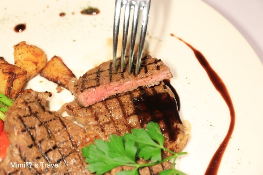 其中一份主餐是炭烤紐西蘭沙郎牛排佐黑醋紅酒醬,紐西蘭牛肉原本就擁有三低美食的封號(低卡路里、低脂肪、低膽固醇),油花少但營養豐富,表面的網狀紋路讓人光看就食指大動,沾點黑醋紅酒醬可以適當的豐富味蕾,旁邊搭配了馬鈴薯、蘆筍和番茄,滿有飽足感。