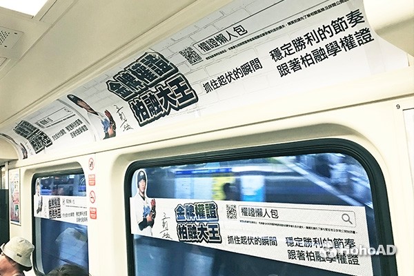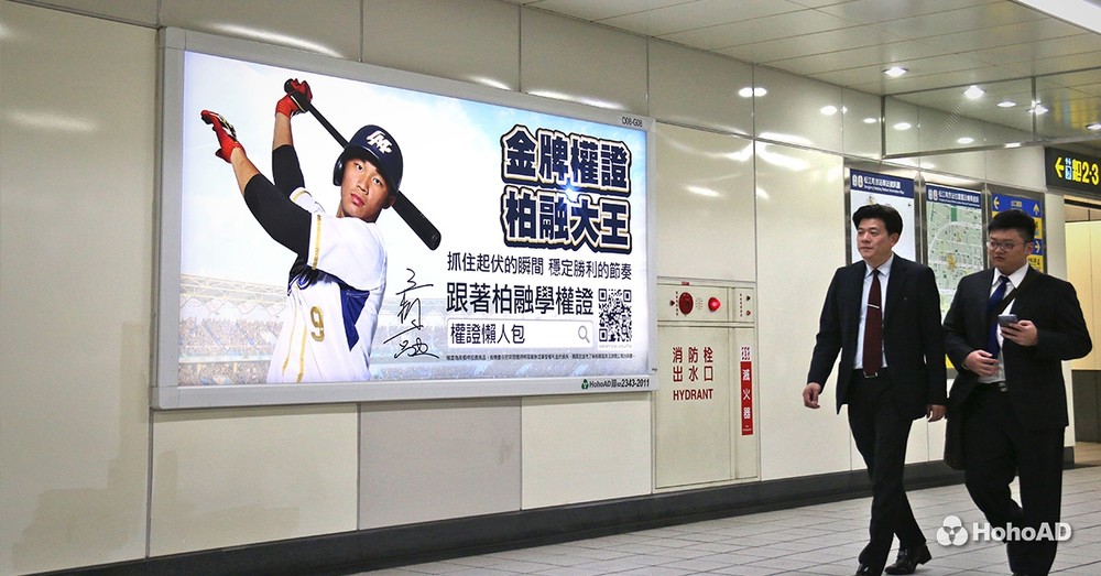 廣告座落於站內廊道、出入口必經顯眼燈箱版位,全方位捕捉消費者目光和潛在目標族群,家外廣告做為媒體涵蓋率極高的媒體,擁有活動性、即時性、高頻率、超大版面等傳播特性,無時無刻、重複傳播,讓權證觀念滴水不露傳達,「權證懶人包」速成超輕鬆,從零到有,必學必知秘笈大解析,任何疑難雜症一點通!