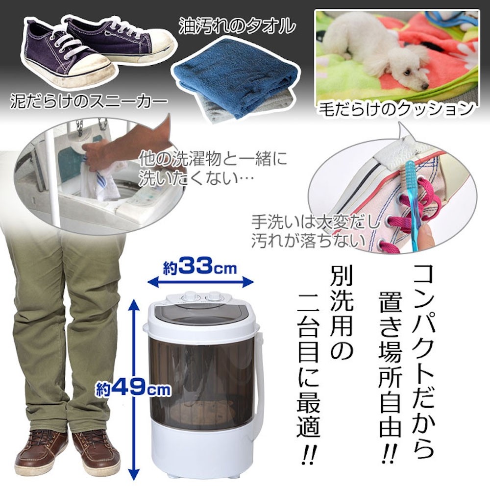 長 33cm、寬 33cm、高 49cm 的「ミニ洗濯機2」,是日本業者針對個人租屋族所設計開發的室內用小型洗衣機,可別看它體積小就覺得它的清潔效果有限,它可是能提供類似大型滾筒洗衣機的清潔與脫水功能,只要將個人衣物、鞋子、甚至寵物使用的毯子丟入,並加入些許洗衣粉或洗衣精,即可透過左右迴轉的強勁水流快速清洗衣物,甚至還能在清洗完畢後進行脫水,減少與其他房客共用公共洗衣機所產生的衛生問題。