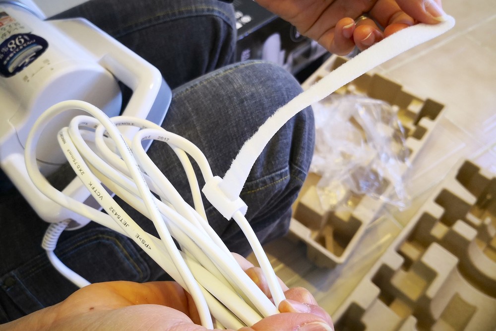 電源線附有固定魔鬼氈,綑綁收納很方便。