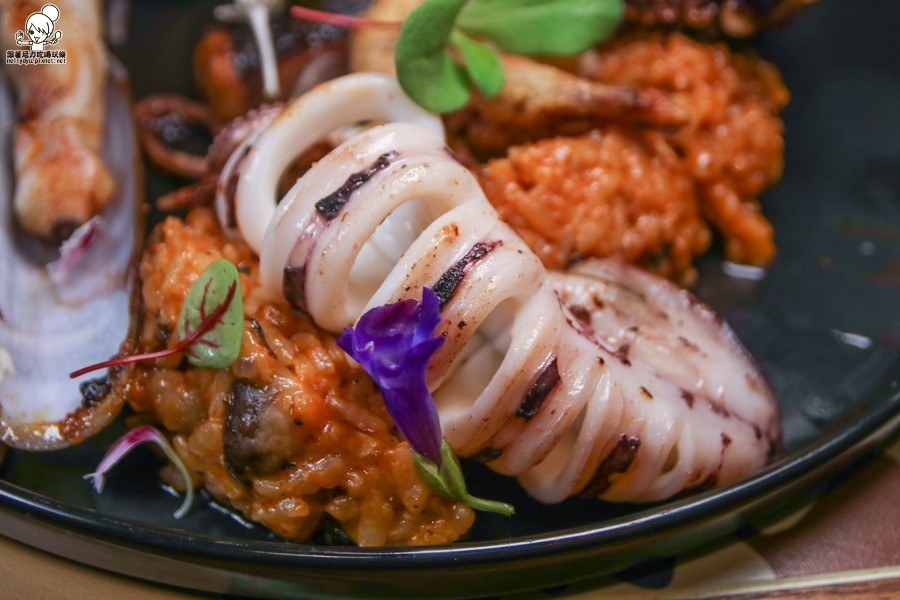 帶有紅醬香氣的燉飯,微微的米心口感飽滿的香氣與海鮮的甜味搭配