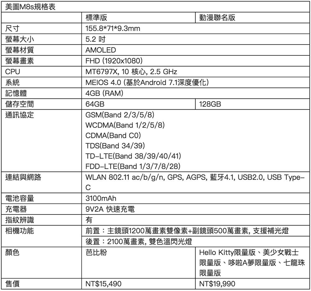 美圖 M8s 前置鏡頭搭載雙像素雙鏡頭,主鏡頭為 1200 萬雙像素鏡頭,副鏡頭為 500 萬畫素專業景深鏡頭,後置為 2100 萬像素鏡頭。美圖 M8s 標準版在台推出女孩最愛的芭比粉,已在聯強通路啟售,單機價 15,490 元。Hello Kitty 限量版、美少女戰士限量版、七龍珠限量版、哆啦 A 夢限量版也於 12 月起陸續在台灣上市,單機價 19,990 元。