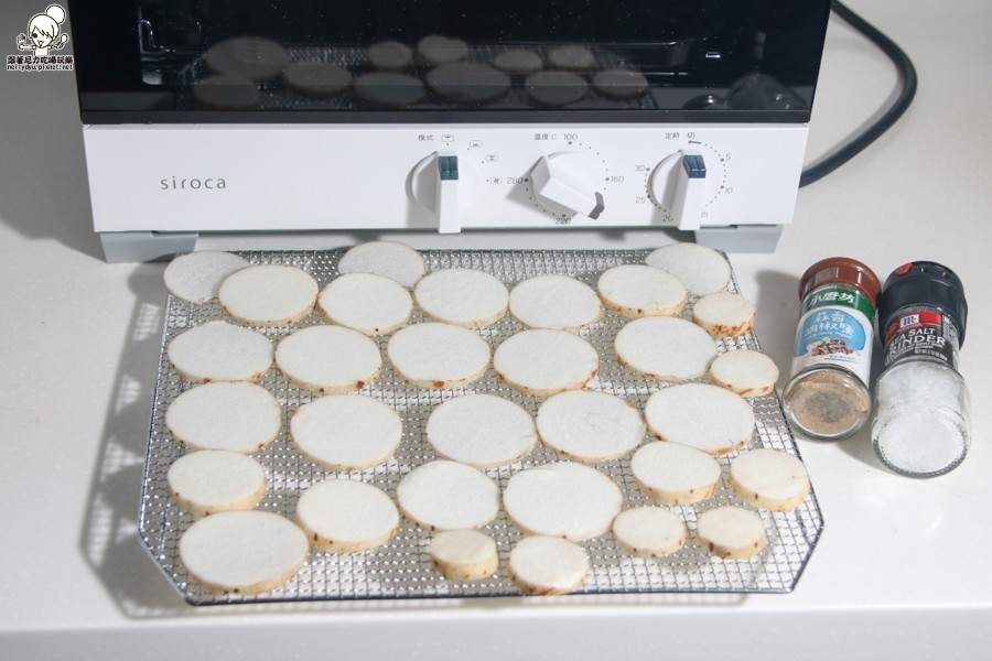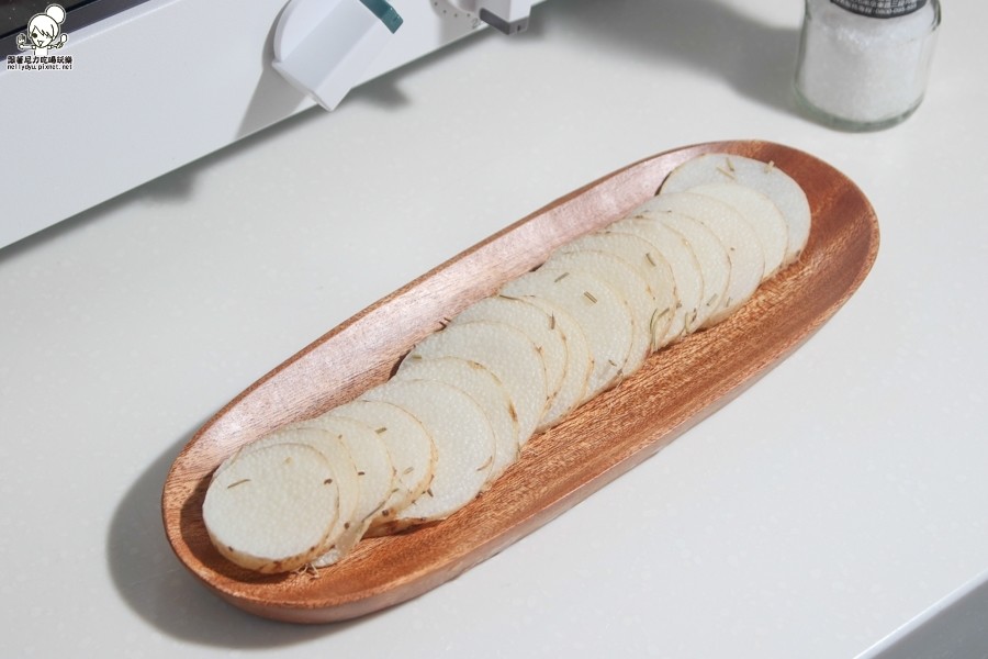 山藥大概切0.3cm,我還會灑上海鹽跟義式香料提味