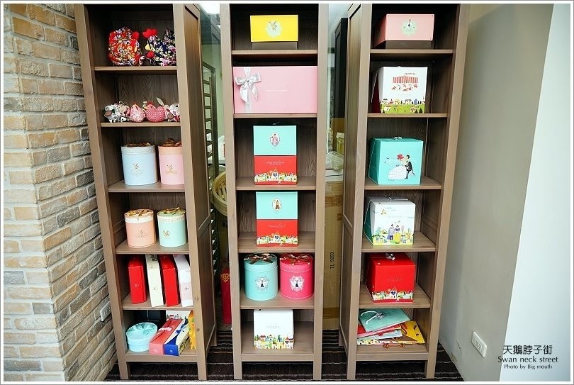 ▼一旁的展示櫃有各式各樣的禮盒,因為他們家有提供喜餅、彌月、手工餅乾等多樣商品,所以光是外盒就有相當多種選擇!