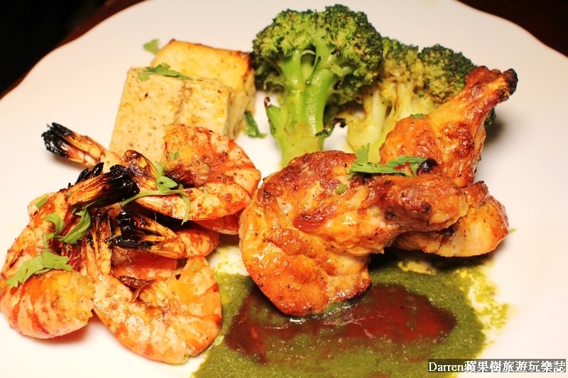 ▲印度坦都里料理,經過燒烤過有濃郁炭香風味,可以沾香料調味,吃來肉嫩多汁連蔬菜都有濃濃碳烤味