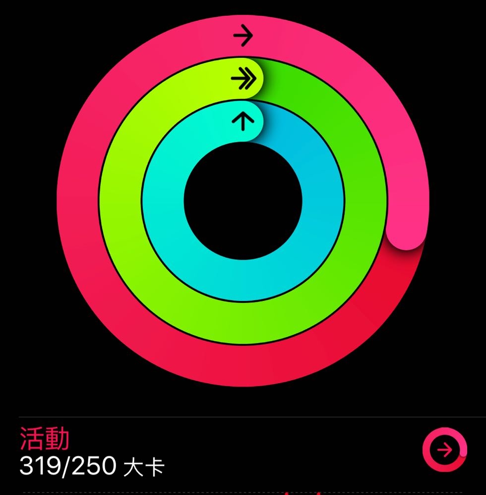 Apple Watch 的「活動」目標指的就是最外面紅色那圈,也就是說如果設定 250 大卡,今天只要完成 500 大卡就能獲得。