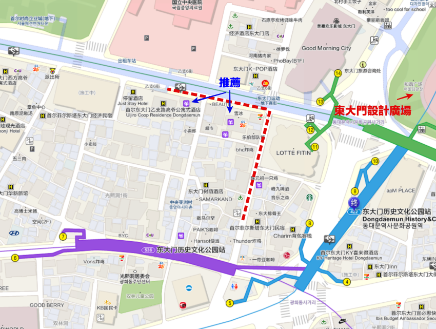 上面地圖標的紅色虛線就是東大門換錢街,從首爾地鐵的東大門歷史文化公園站出來,看是要走8.12號出口都可以,大概3分鐘就能抵達。