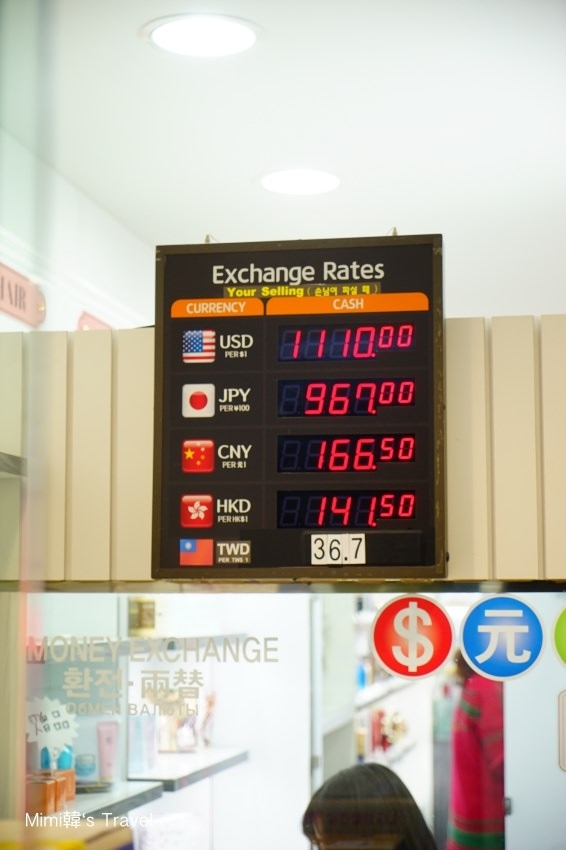 美金匯率1 : 1110(和其他間都一樣);台幣匯率1 : 36.7,也就是說同樣換10000台幣的話,這裏會比其他家換多出7000韓元,也是不無小補,但匯率是隨時變動的,不代表每次來換都一樣喲~