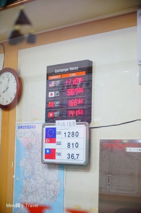換錢匯率的話,這天看起來美金匯率幾乎都是1美金:1110韓元,倒是台幣有點差異。從1台幣:36~36.7韓元不等,其中又以大馬路旁的那兩間最好(上面地圖有標),難怪背包客棧裡面滿多人都是推薦 GS25 旁邊那家。