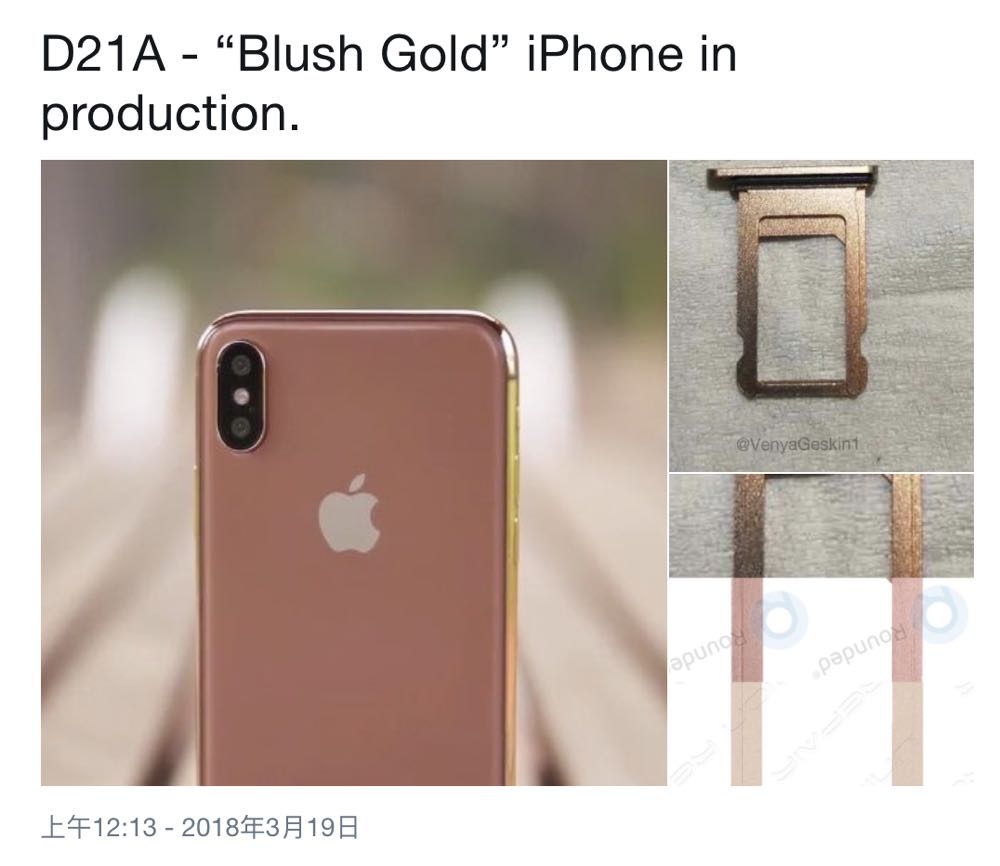 隨著 3 月 27 日的 Apple 春季發表會日子越來越近,現在就有知名爆料 Twitter 為 iPhone X 搶先帶來新色 – Blush Gold 的曝光照!根據爆料者所公布的照片,我們可以看到 Blush Gold 與以往的玫瑰金在色澤上很明顯的較為深邃、更多了點橘紅的典雅光澤!
