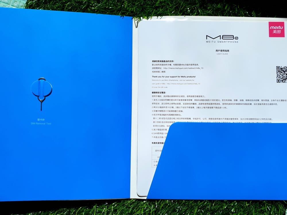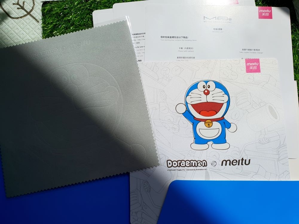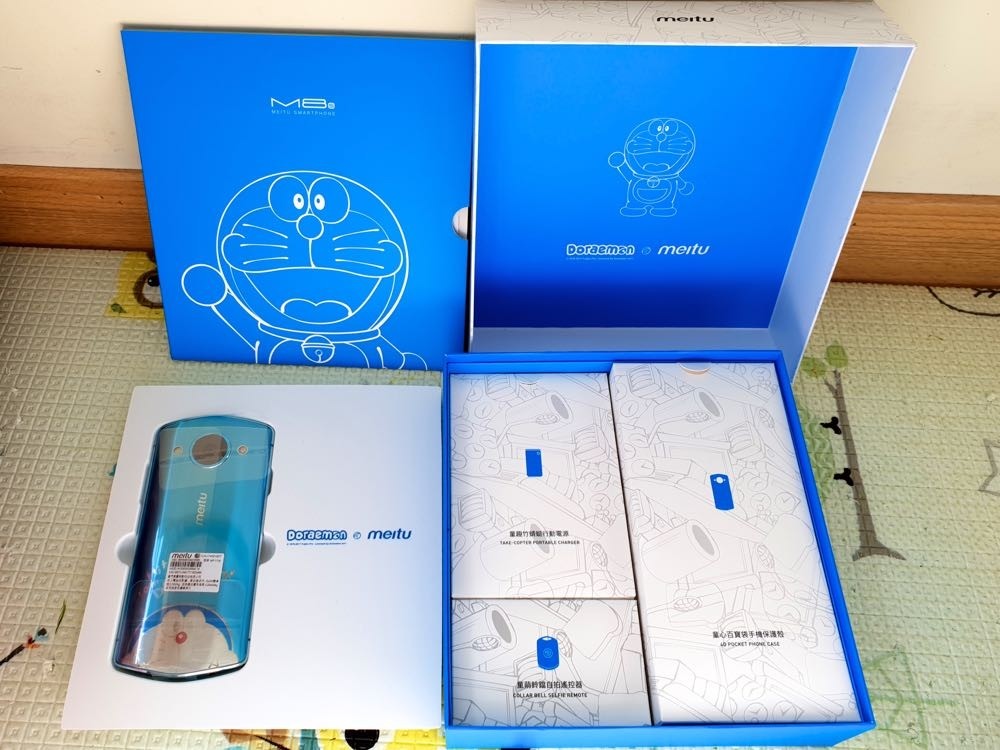 ▲ 整個盒內共包括了 M8s 手機、哆啦 A 夢行動電源 (5000mAh)、鈴鐺自拍遙控器、保護貼 x2 、保護殼、說明書、擦拭布和收藏證書。
