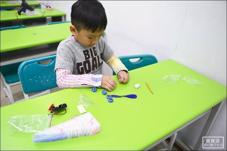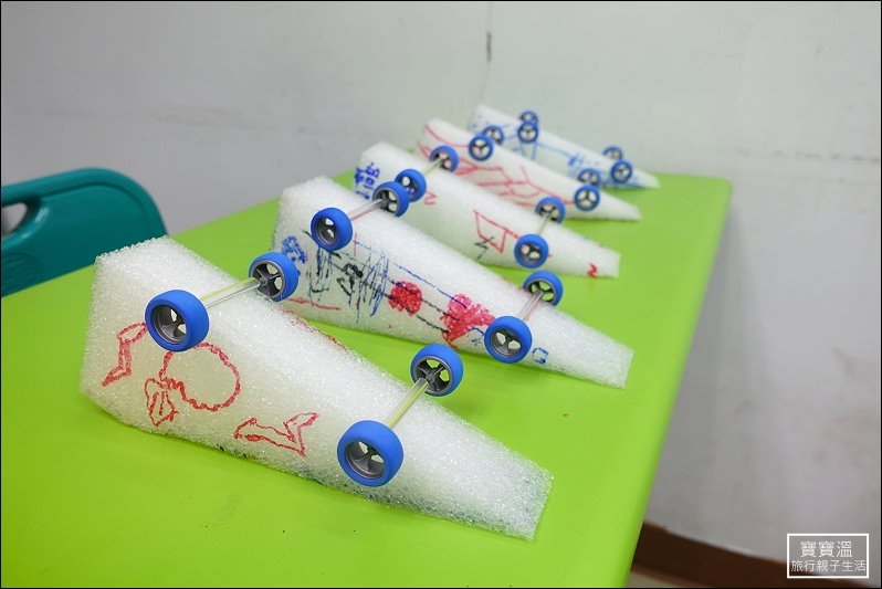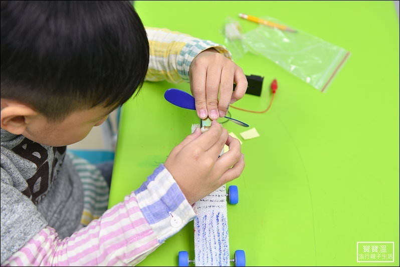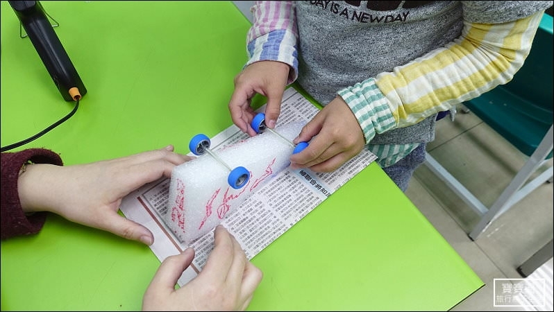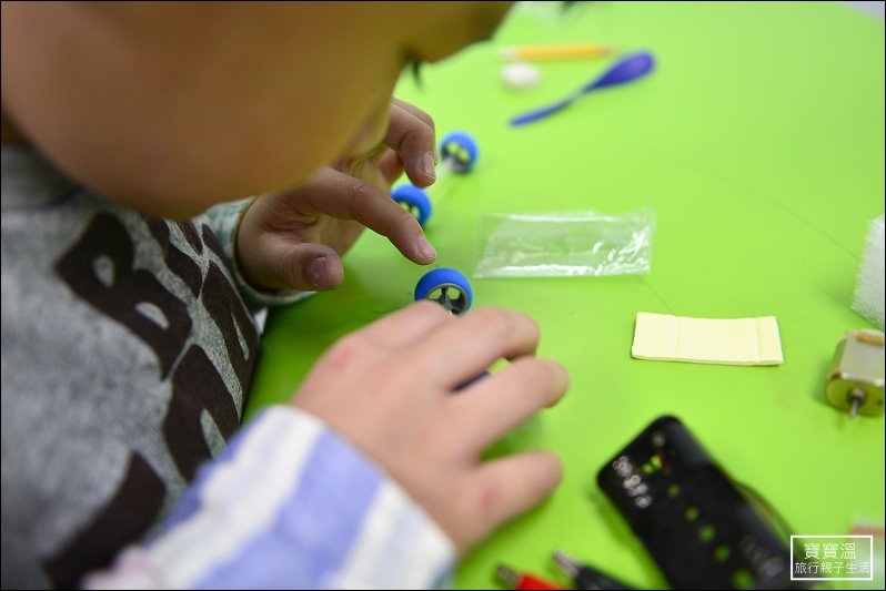 ▼ 組裝車輪的位置會讓孩子自己選擇,這也是實驗的一部分,每個元件的組裝都是經過孩子的思考而決定,最後的實驗結果就交由速度來決定,看誰跑最快
