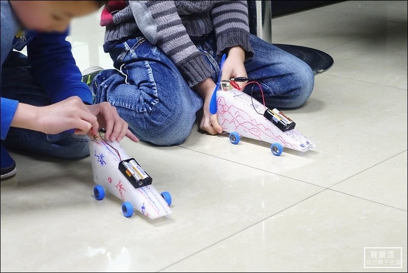 ▼ 有了螺旋槳汽車,幾個小男生很快就打成一片,一直比到下課了都還不肯離開,輸的人會一直研究到底哪裡沒組裝對,一直改良自己的汽車,這樣才是真正的科學課,你說對吧!!