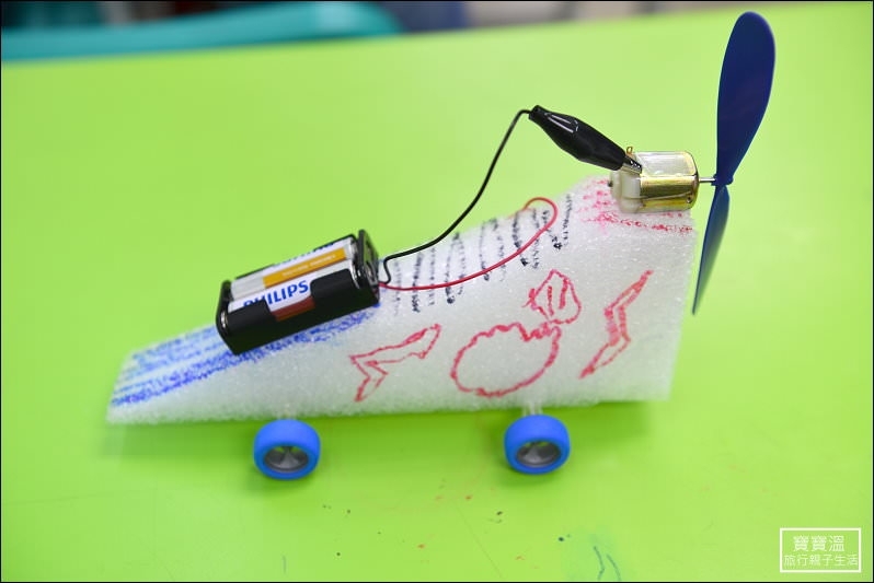 ▼ 福寶哥的螺旋槳汽車完成,從機身彩繪到車輪、引擎、電池都是福寶哥自己動手完成的喔