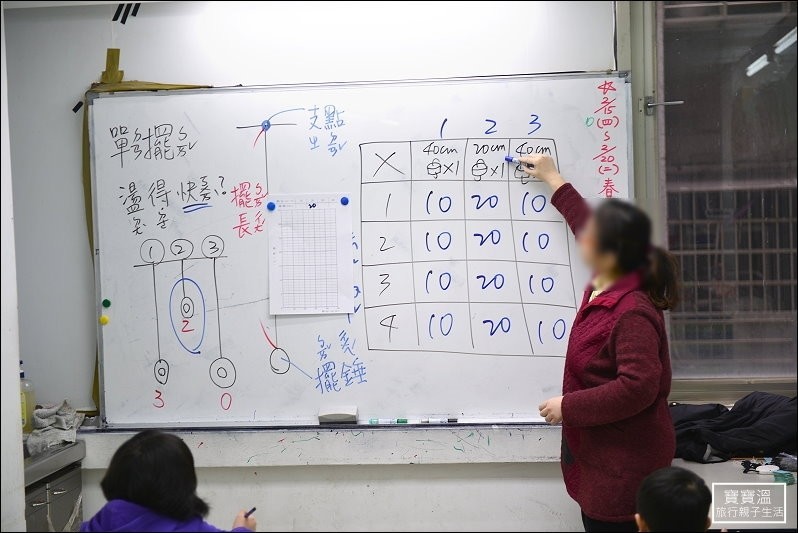 ▼ 講說完單擺是如何擺動,老師會帶著孩子設計實驗,這個實驗主要是要比較擺長、擺錘重量、擺動速度三者的關係