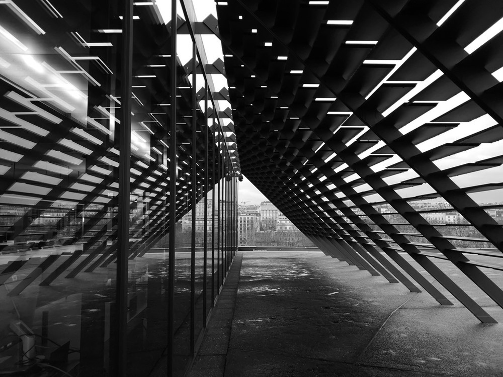 有設計感的擋陽板,與落地窗倒影,構成很棒的三角形。