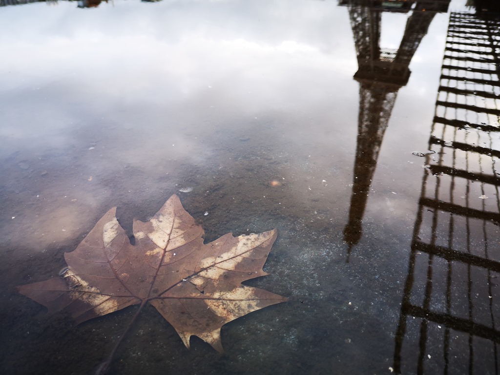 水中的枯葉伴著倒影的鐵塔,很有雨天的憂鬱感。