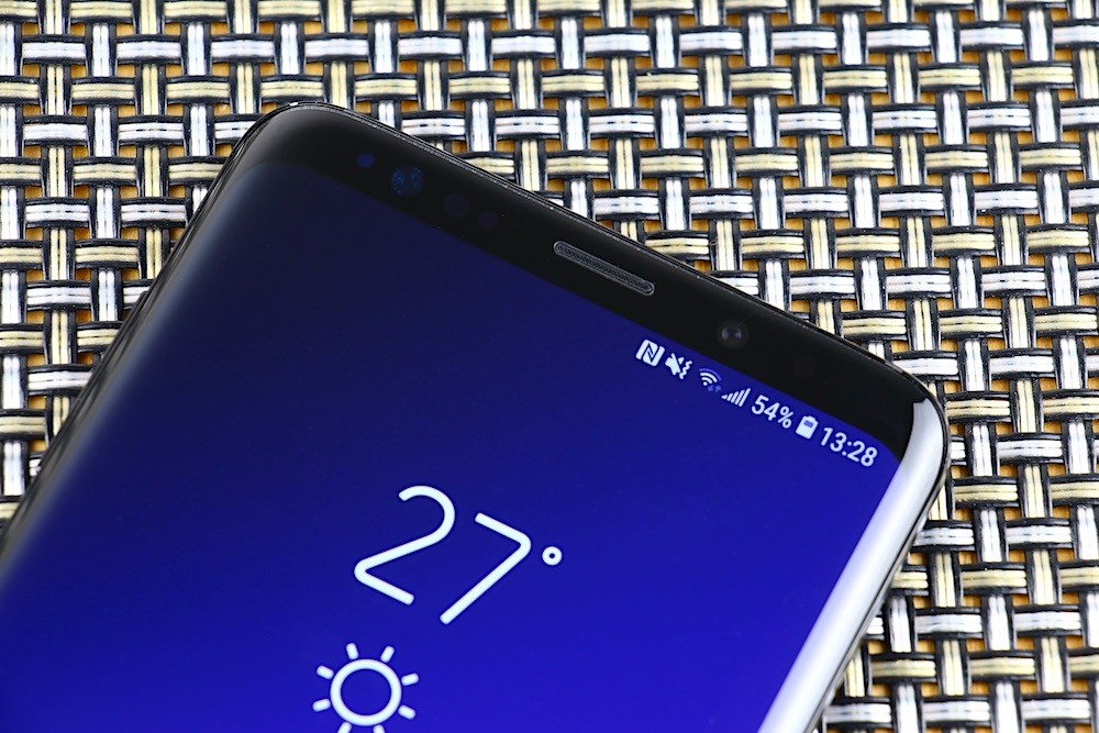 螢幕上方除了配置經 AKG 專業調教,且可作為高音喇叭使用的聽筒之外,一旁還有具備 F1.7 大光圈的 800 萬畫素自拍鏡頭、虹膜辨識器、LED 指示燈。值得一提的是,Galaxy S9+ 還內建智慧辨識功能,當使用者戴著太陽眼鏡,且沒辦法使用虹膜辨識時,手機會自動切換為人臉辨識模式;相反的,如果使用者戴著口罩,完全沒辦法使用人臉辨識時,則會自動切換為虹膜辨識,讓手機在各種狀態下都能快速解鎖。