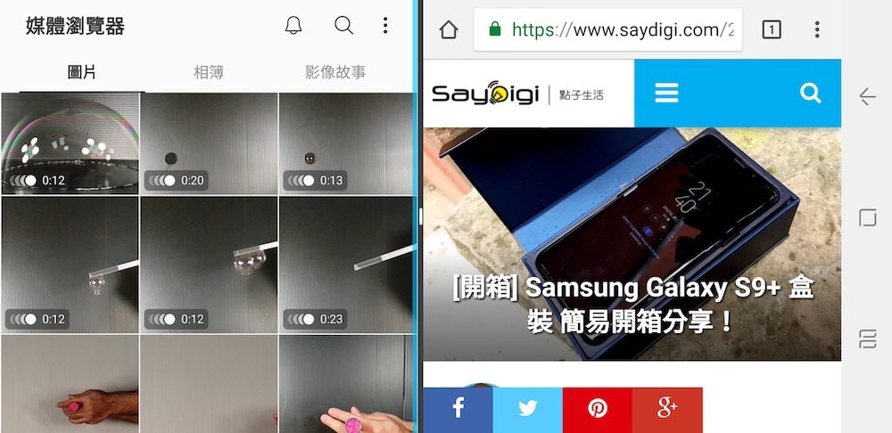 Galaxy S9+ 配備 18.5:9 的 6.2 吋雙曲面 Infinite Display,畫面顯示範圍非常適合進行分割,讓一個畫面可以同時開啟兩個功能,不管是要將媒體瀏覽器中的照片上傳至社群網站,或是想要在邊追劇的情況下與朋友話家常,都可以非常輕易的達成。