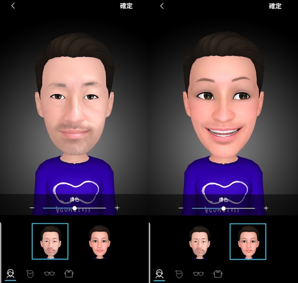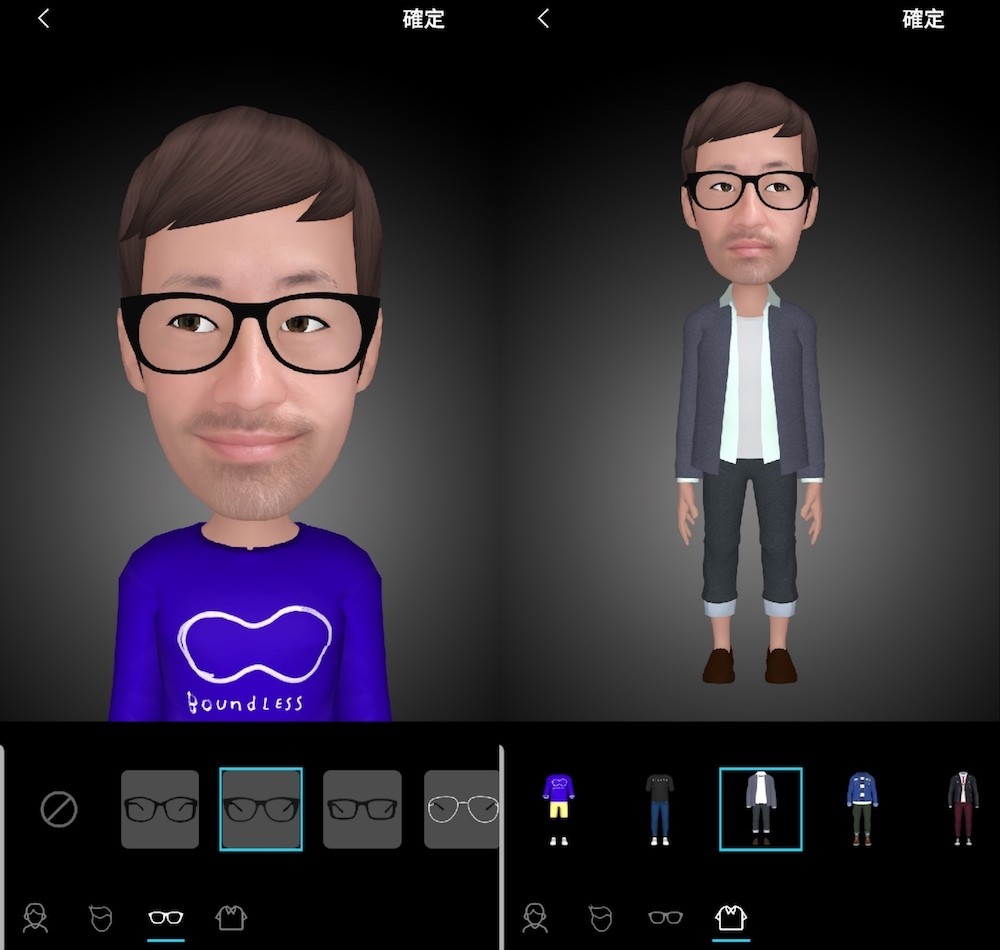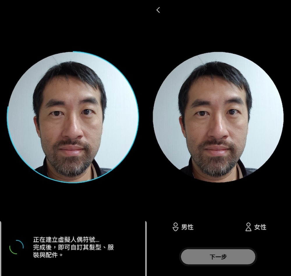 分析完成後,就會立即建立一個套用臉部表情與特徵的虛擬人偶,除了可以選擇膚色、表情之外,還可以利用內建的配件功能,替自己的虛擬人偶選擇適當的髮型、配件以及穿搭服飾。