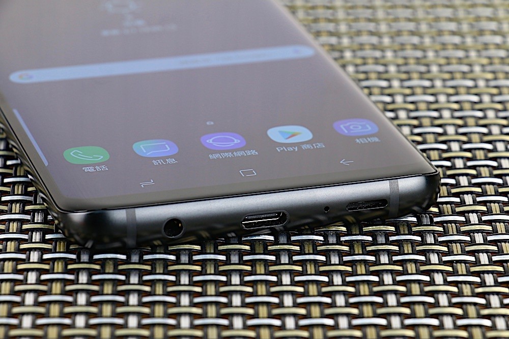 Galaxy S9+ 的機身底部,由左至右分別是 3.5mm 耳機孔、USB Type-C 連接埠、麥克風,以及經過 AKG 專業調教的中低音喇叭。