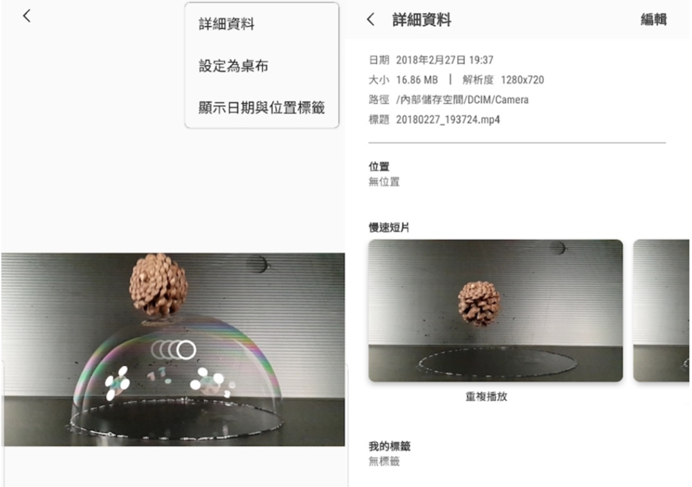 經超慢動作攝影所拍攝的作品,可透過內建的剪輯功能進行剪輯、配樂,只要開啟預覽作品頁面右上角的清單,接著點擊「詳細資料」,就能直接選擇慢速短片的呈現方式,可用重複播放、倒轉、旋轉三種無限迴圈風格製作動態 GIF,讓每支超慢動作短片有不同的呈現方式。此外,後製完成的 GIF 檔案還可以設為螢幕鎖定畫面,隨時重現超慢動作精采畫面。