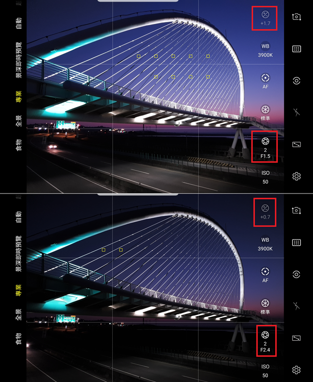 在專業模式下,除了可以手動調整白平衡、ISO、對焦點、曝光時間外,還能調整光圈大小,這對於喜歡在夜間拍攝車軌的朋友是更為方便的功能,F2.4 比起 F1.5 EV 大約降低一級的亮度,所以在曝光時間上就可以提高一些,讓光軌的拖曳更美麗。