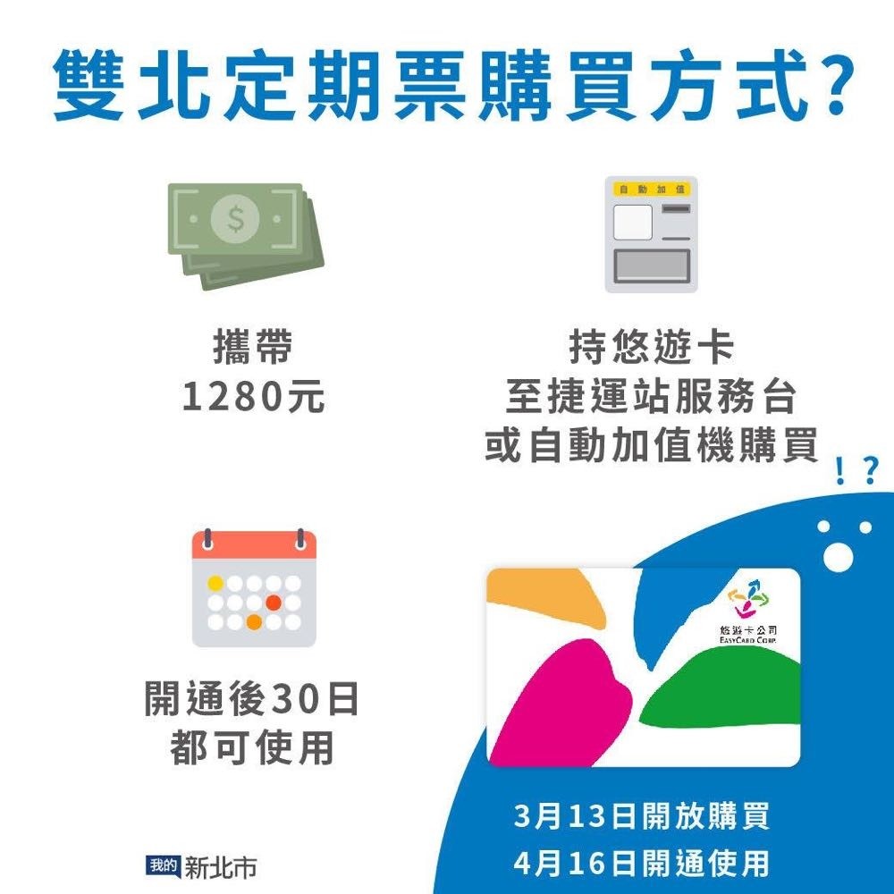雙北定期票將自明日 (13 日) 開放購買,4 月 16 日開通使用,用戶能在開通 30 日內不限次數使用,票價為 $1,280 元。有興趣的朋友只要持悠遊卡至捷運站服務台或自動加值機購買,開通後的 30 天內就可以使用。
