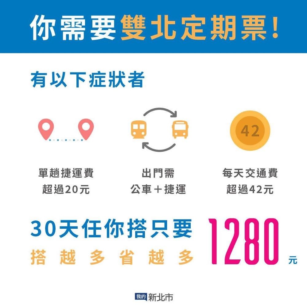 對每天花上大量交通時間與金錢往返的台北 / 新北居民來說,今天可以是說有個大好消息的星期一!原來是台北市長柯文哲與新北市長朱立倫共同宣布將推出 NT$1,280 元的 30 日無限次使用的雙北定期票,使用範圍包括了雙北捷運、臺北市聯營公車及新北市市區公車(僅限段次計費路線,不含里程收費公車),並於雙北市境內租借 YouBike 前 30 分鐘免費!