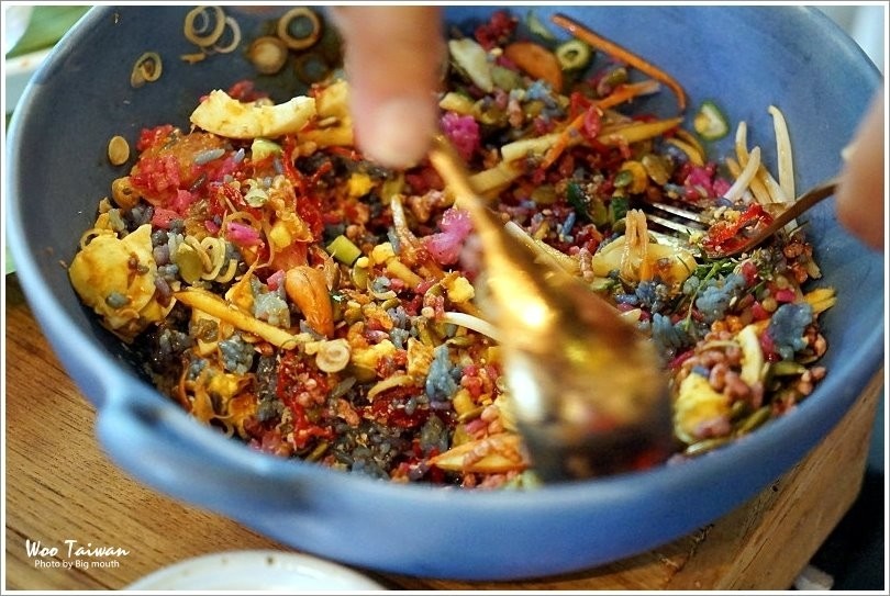 ▼裡頭的配料超級多,像是蘋果、南瓜子、米香、蝦米酥、小黃瓜、豆棗、椰子酥、青檸葉、胡蘿蔔絲、香茅、葡萄柚、長虹豆、腰果、豆芽菜、辣椒粉、胡椒粉等依序放入盆中,看起來繽紛又豐盛!