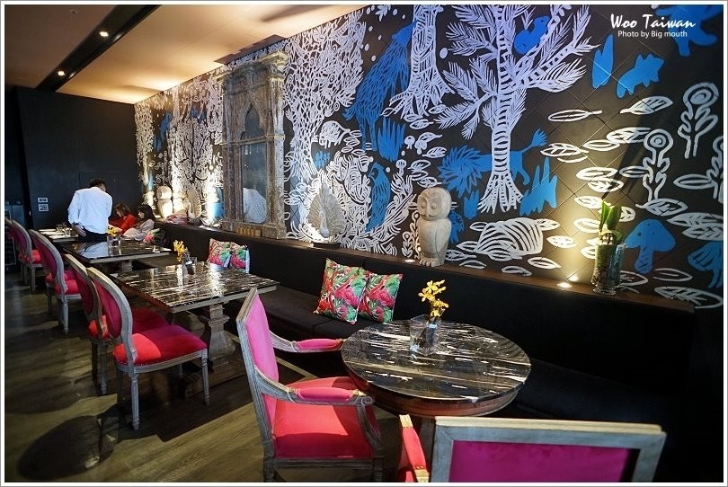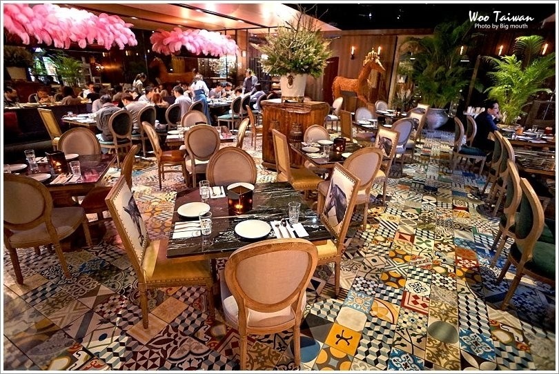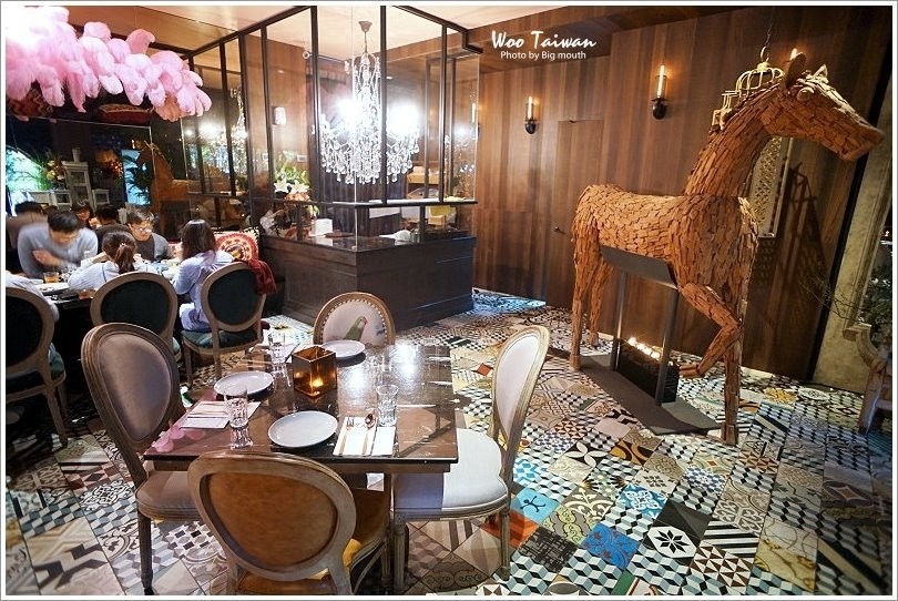 ▼另一側用餐區還有粉紅色羽毛裝飾,也是超熱門的用餐區塊!此外餐廳裡頭還擺放了原木設計製成的馬匹,搭配多元又豐富的地磚,看起來一整個超吸睛!