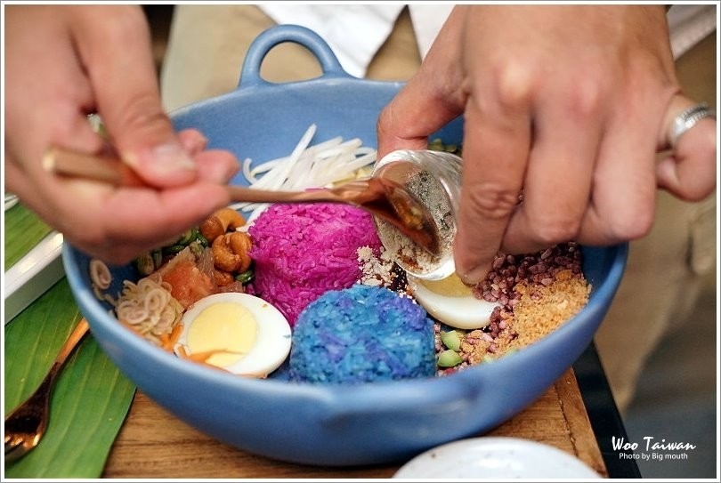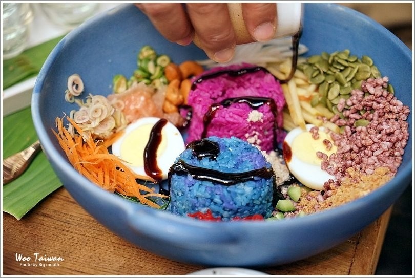▼招牌雙色米沙拉,除了有加入紅龍果、蝶豆花的米飯與水煮蛋之外,一旁還有超多款配料與醬料,看起來超澎湃的啦!