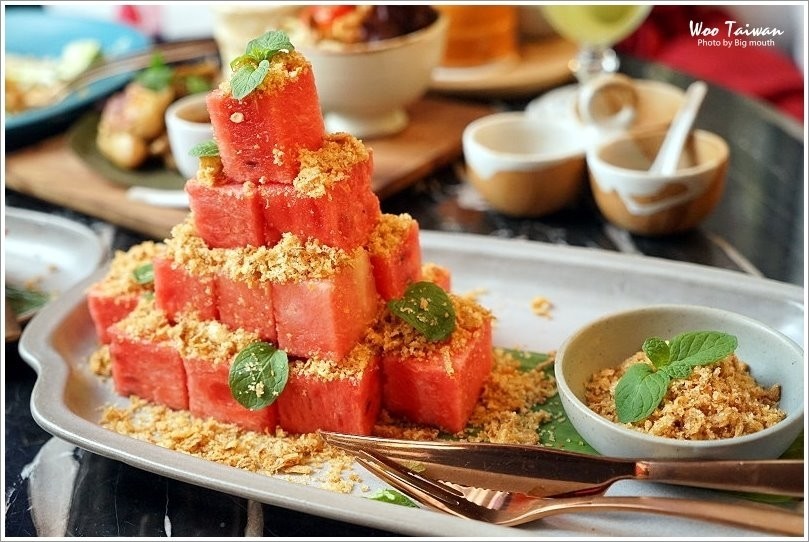 ▼切成塊狀又疊高高的西瓜不僅鮮脆又香甜,搭配鹹甜交錯的魚酥,酥脆又多汁的味蕾乍吃之下有點不太習慣,沒想到吃久了竟然還蠻涮嘴的耶!這讓大口想到之前去馬來西亞吃到的水果囉喏,也是採用蝦醬與其他配料一起搭配新鮮水果享用,吃起來有異曲同工之妙!