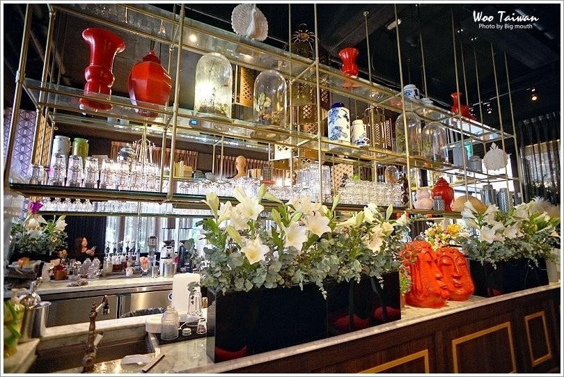 ▼裡頭更是華麗到一個不行,尤其是中間這個U字形吧台,不僅採用大量花藝當作裝飾,仔細看上頭鏤空的銅架更是放了各式藝術品、擺飾與造型杯具,讓人目不暇給啊!