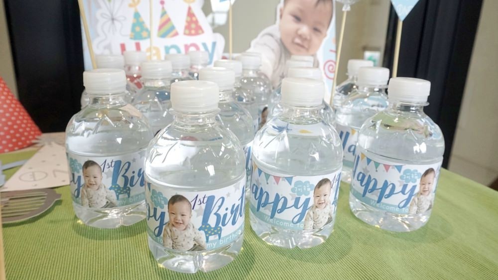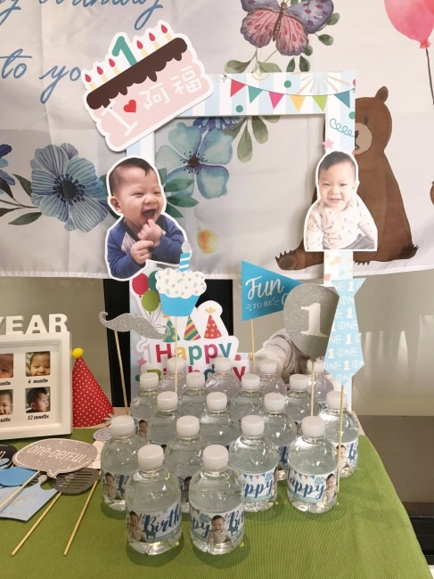 我準備了蠻多道具可以讓大家拍照,還有包裝水可以帶回去作紀念。因為來這裡的朋友們有從台北特地過來參加、桃園過來的朋友、工作前趕過來、工作後趕過來、特別把假日騰出來參加阿福生日派對的每一個人,希望他們除了可以拍到各種值得紀念的照片之外,還有個小小紀念品,作為我們一家的心意。