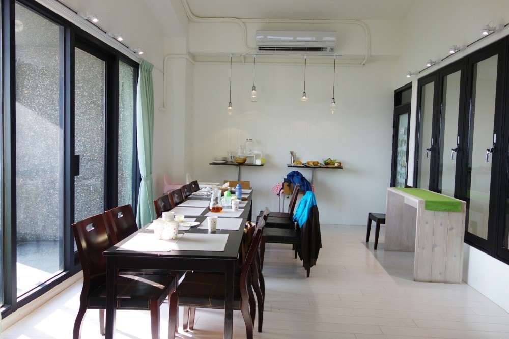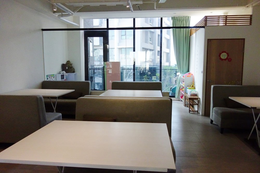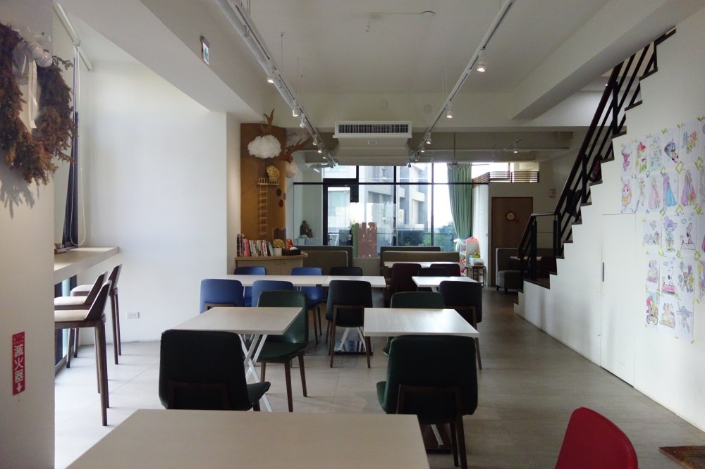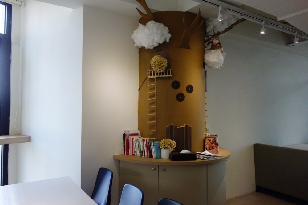 這是我們三樓的主要空間,後方還有座位區與遊戲區,但因為後方的座位區沒有自然光,比較暗。所以後來我們就把後面的桌子拉一張到前面來,讓大家可以坐在一起並且曬曬太陽享受這美好的一天。